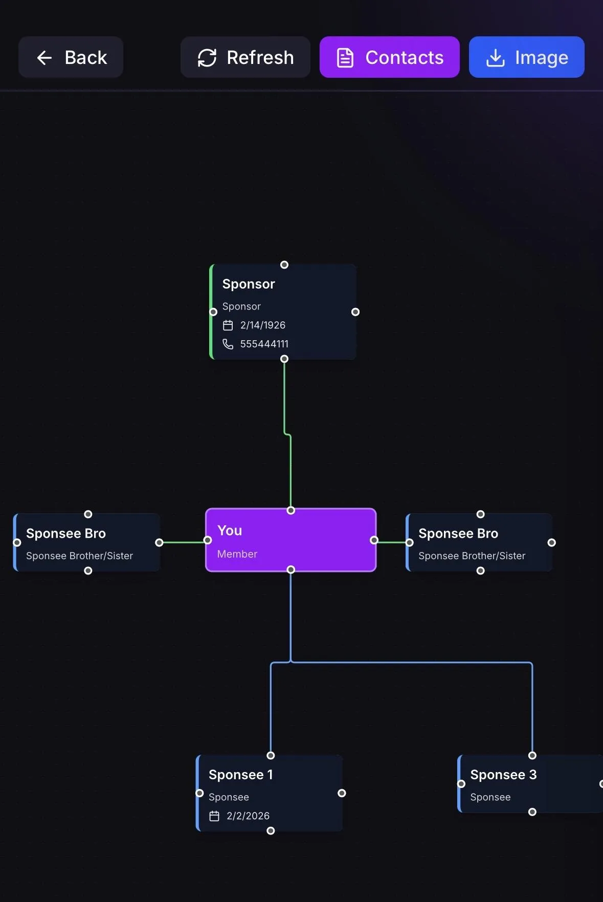 Visualize your entire recovery network, from your sponsor's sponsor all the way down to your sponsees.